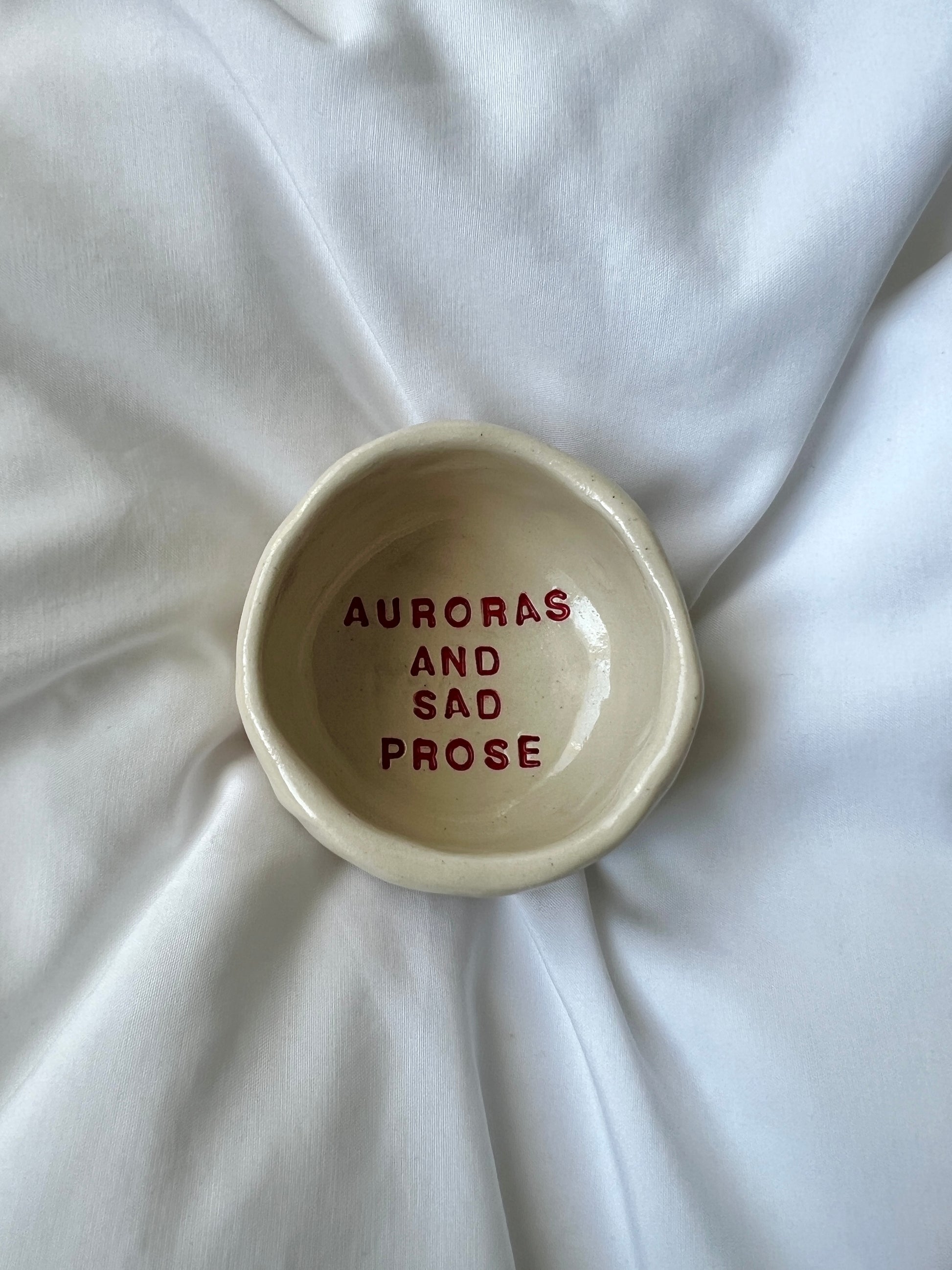 The text 'auroras and sad prose' sits in the middle of your trinket dish.