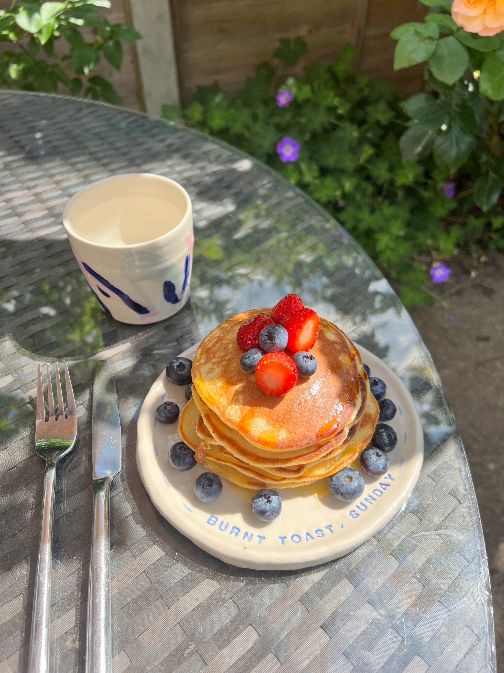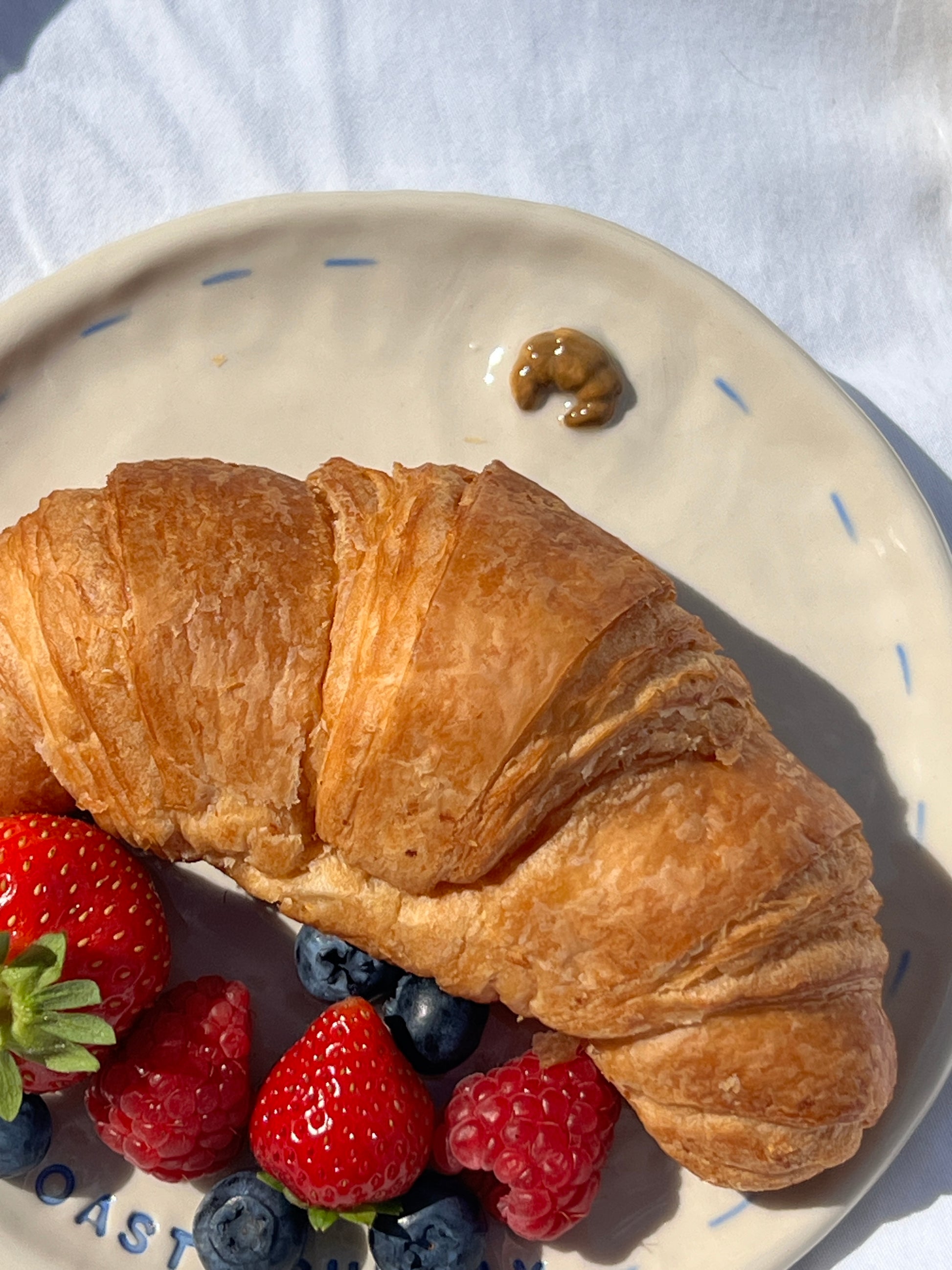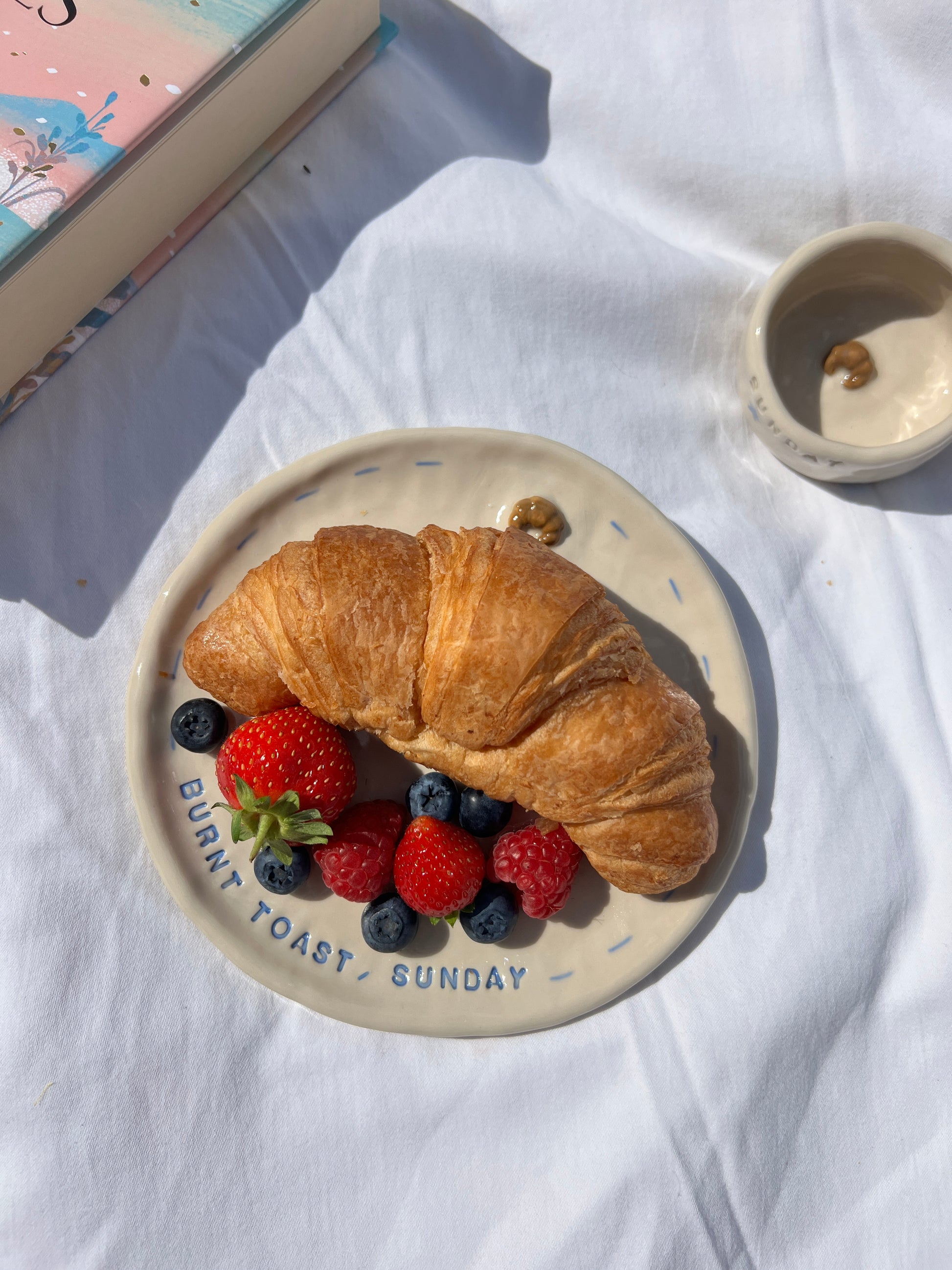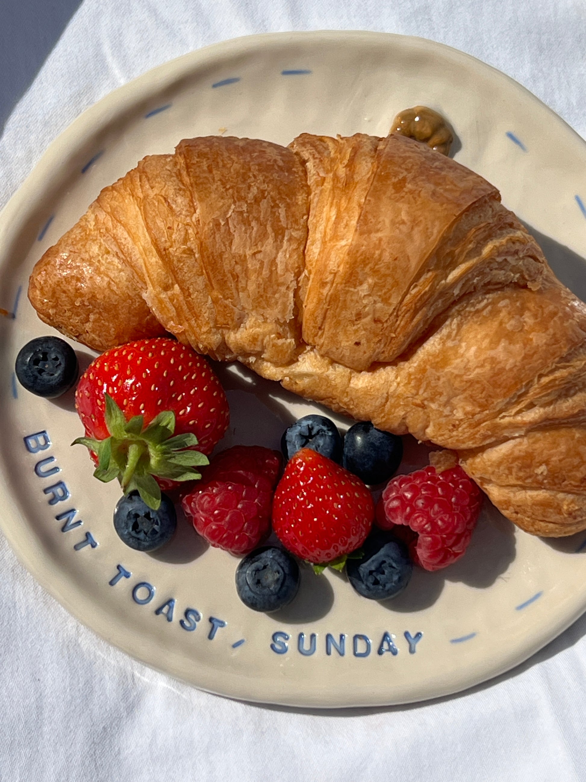 Handmade with high quality stoneware clay and finished with a 3D croissant. Designed for your Sunday morning fruit, pastries, pancakes or even a small fry up.