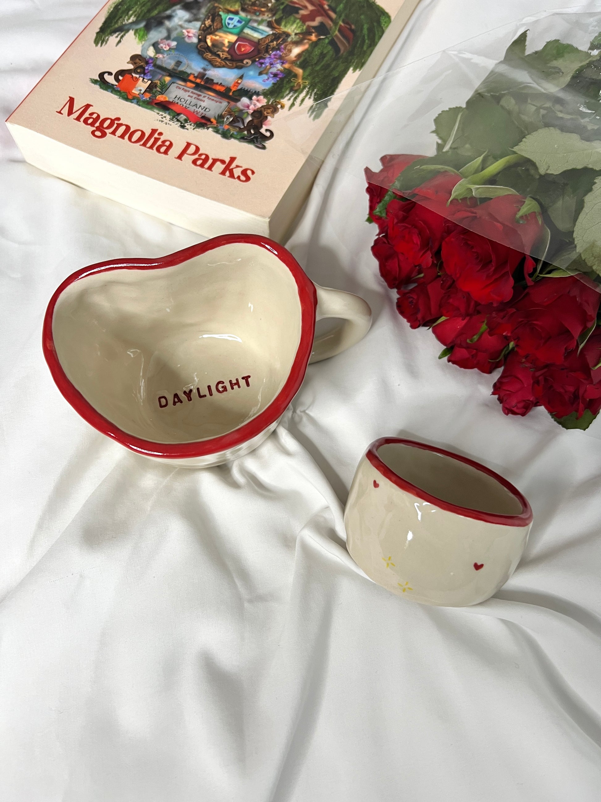 Handmade with high quality stoneware clay and shaped into a heart with a delicate red rim.
