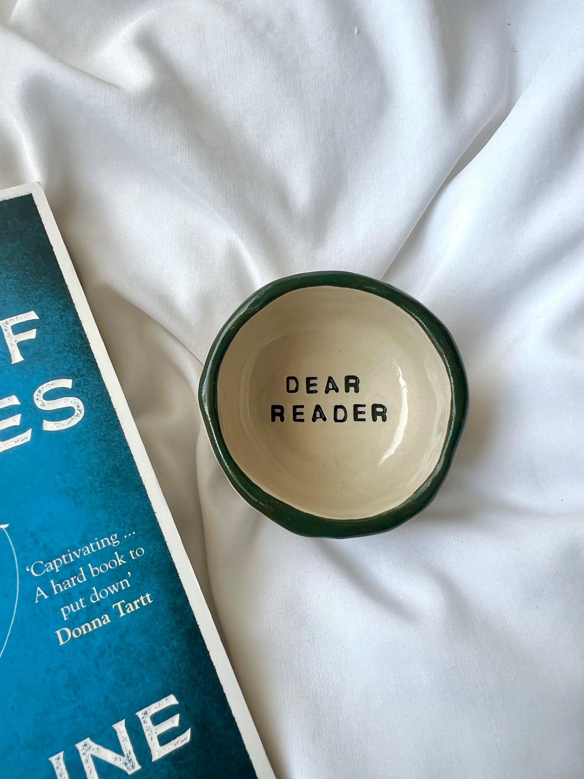 The text 'dear reader' sits in the middle of your trinket dish.
