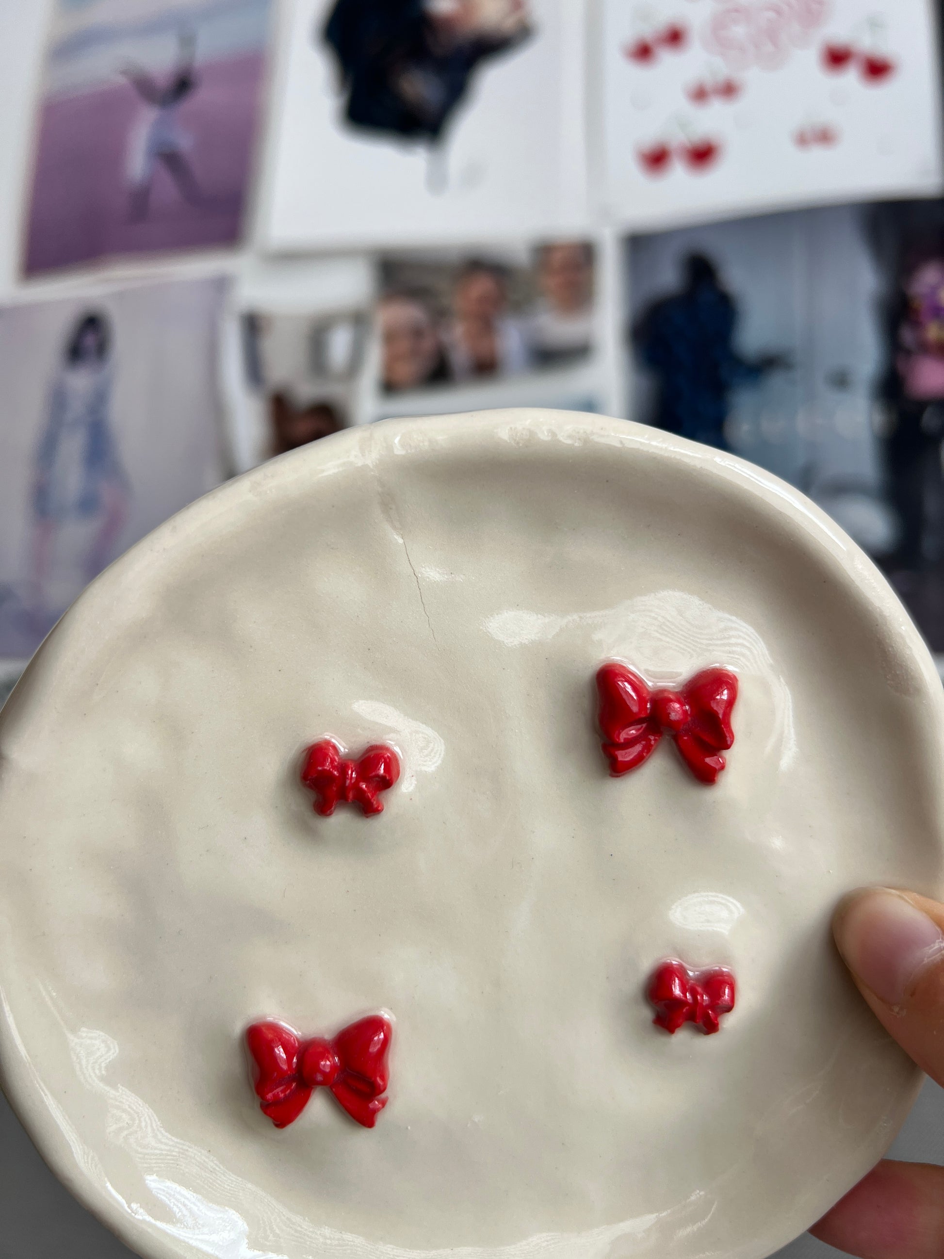 Handmade with high quality stoneware clay and finished with delicate red 3D bows.